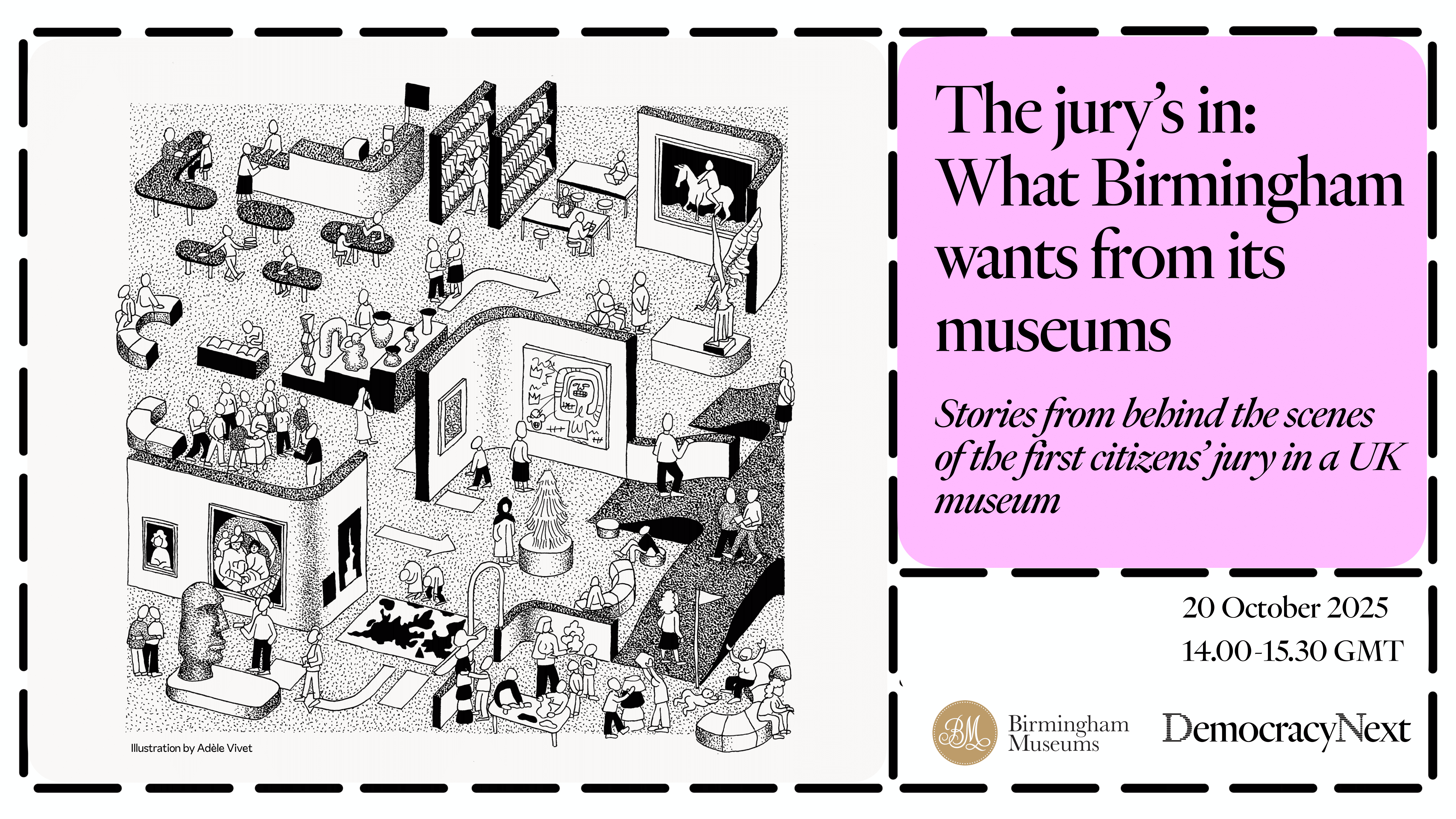 Join us for a webinar co-hosted by Lucy Reid (DemNext) and Charlotte Holmes (BMT) with some of the people involved in the process, including some of the citizen jurors, Sara Wajid, co-CEO of Birmingham Museums Trust, Mara Livermore and Rowan Harris from Shared Future, Mathew Beckett from River Rea Films and evaluator Isabella Roberts.