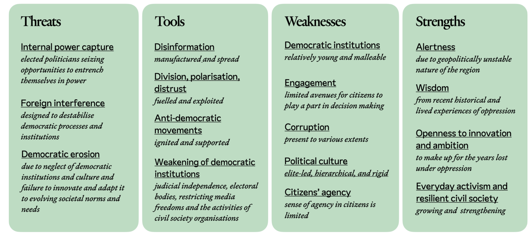Figure 1 attempts to broadly identify the main threats to democracy and indicates some of the tools used to undermine it in the region. It identifies the relative weaknesses and the strengths of democracies in Central and Eastern Europe that potentially make them vulnerable to authoritarianism, but which also provide windows of opportunity to resist.