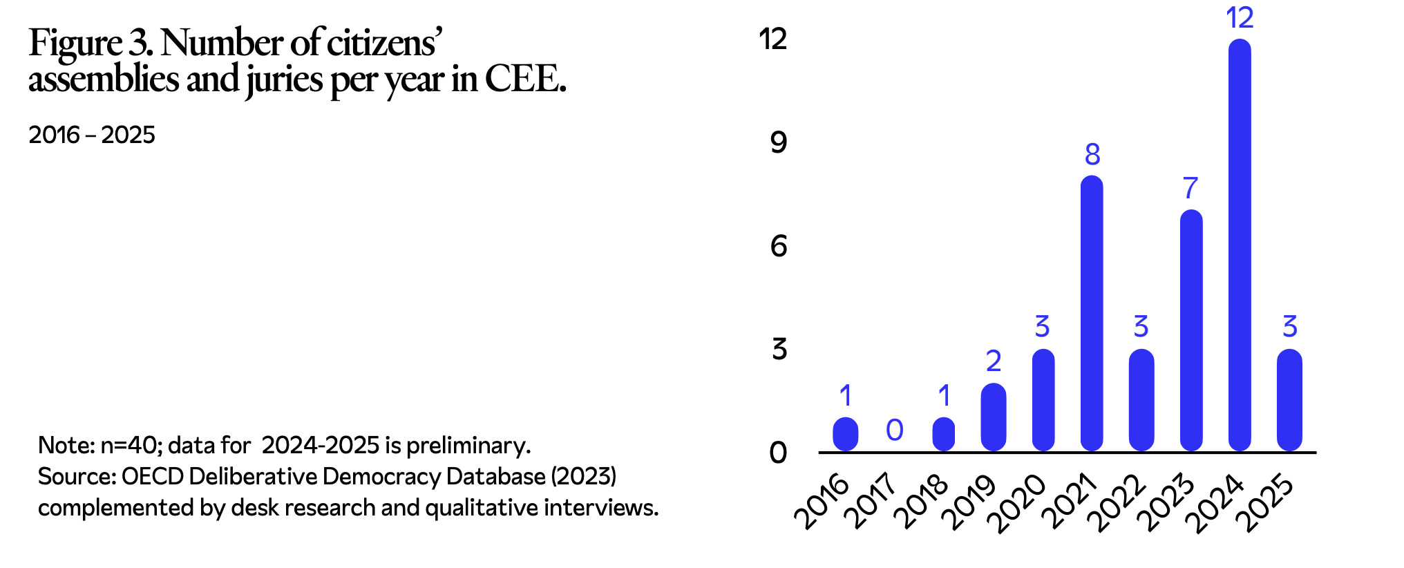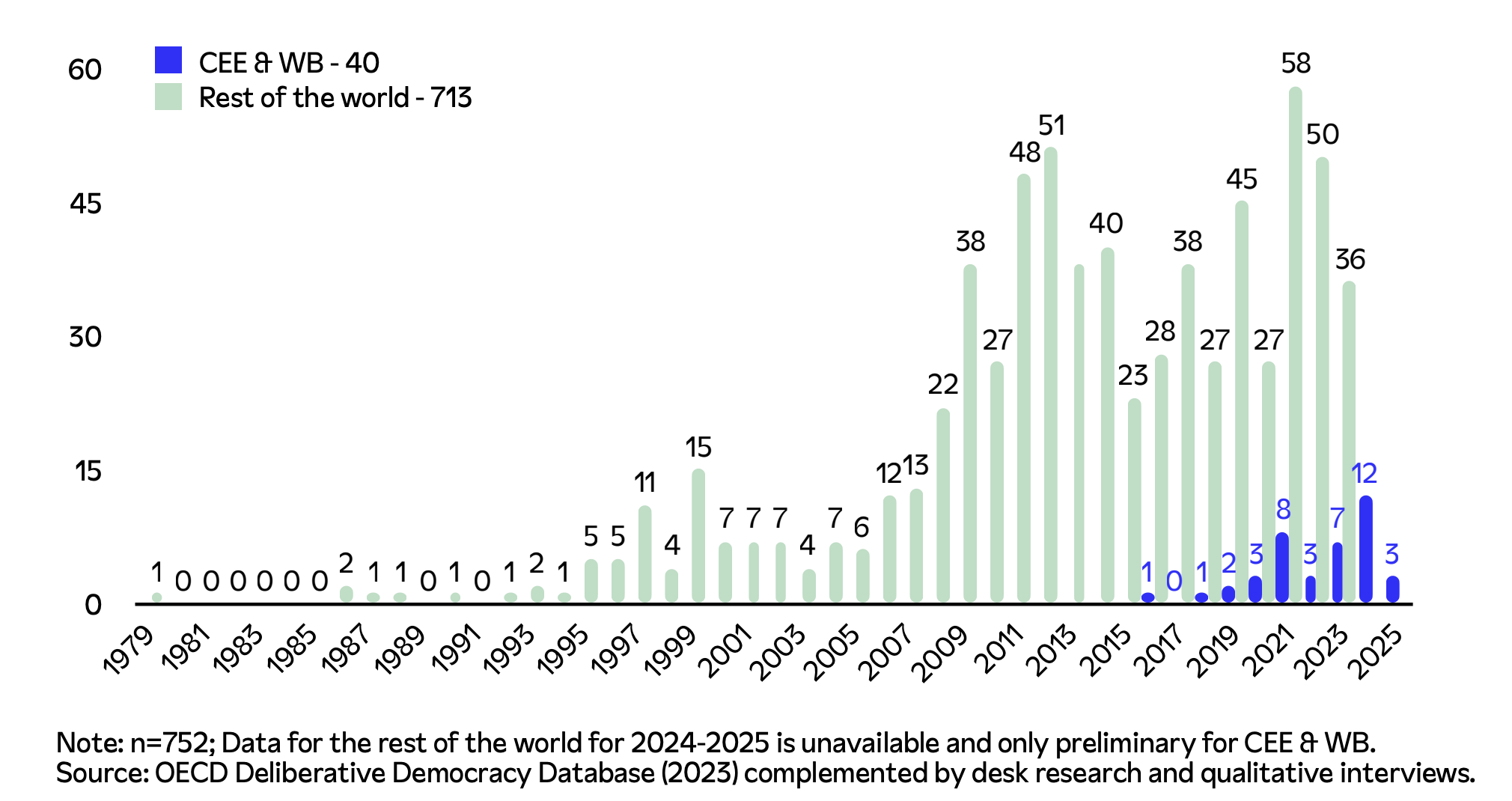 Evidence shows that since 2016, a “deliberative wave” of 40 deliberative processes has been building up in Central and Eastern Europe and the Western Balkans, and is gaining traction in 2024-2025, with at least 11 deliberative processes underway or planned.