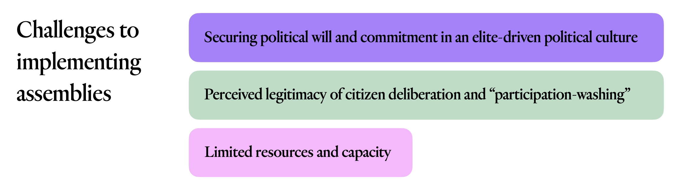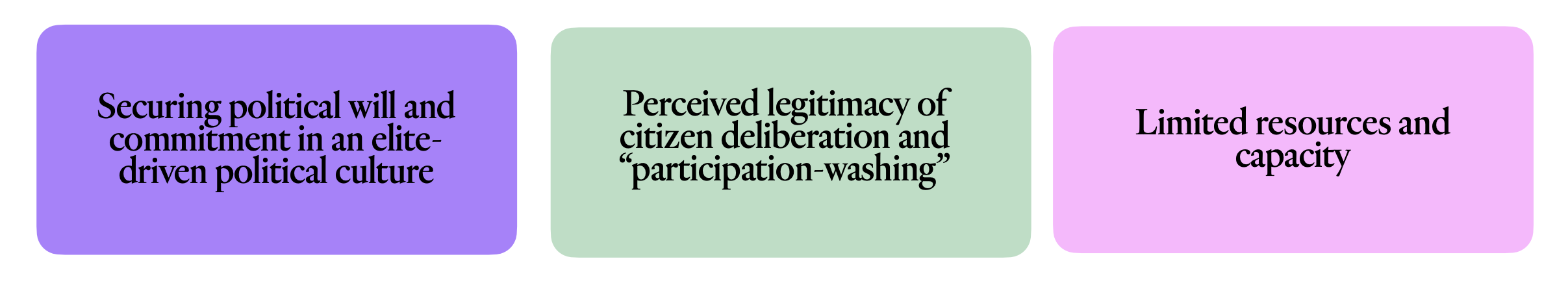 Interviews with practitioners advocating for and running citizens assemblies in the region have uncovered several contextual challenges to citizens’ assemblies, but also shed light on the remarkable resilience and adaptability as well as creative approaches they have taken to mitigate them.
