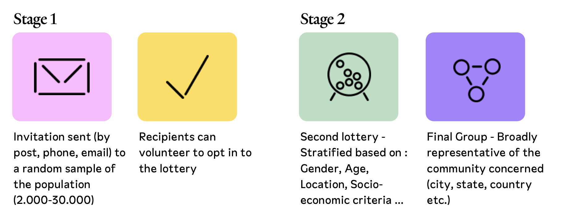 Assembly members are selected by lottery to be broadly representative of a community, which means everyone has an equal chance to be selected to represent others. The selection process, called sortition, takes place in two stages. In the first stage, a large number of invitations are sent out to a group of people chosen completely at random. Among everybody who responds positively to this invitation, a second lottery takes place to ensure that the final group broadly represents the community in terms of gender, age, geography, and socio-economic differences (DemocracyNext, 2024). This is known as stratification.