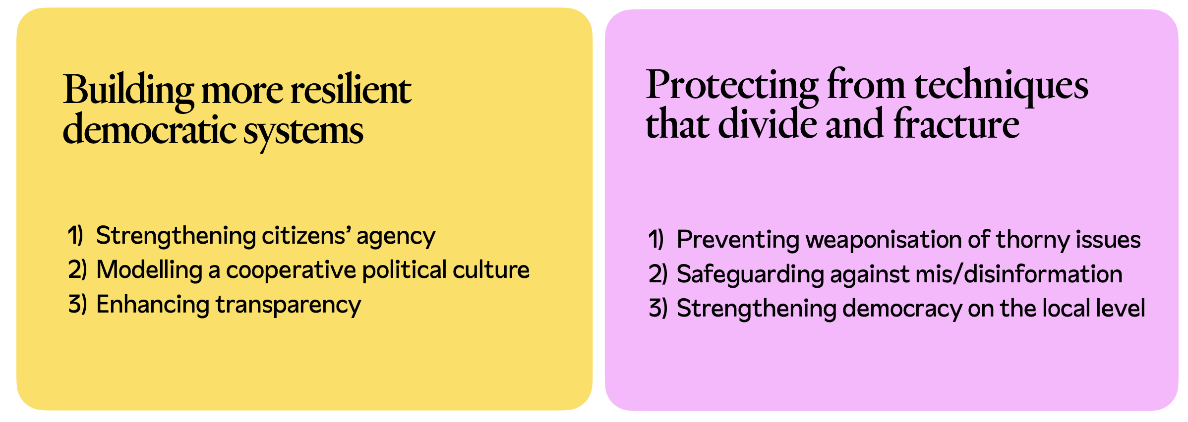 The other major way citizens’ assemblies could contribute to addressing authoritarianism in Central and Eastern Europe is by helping protect societies from techniques employed by malign actors and forces intended to disinform, fuel divides, and cause fracture. Citizens’ assemblies could be used strategically to constructively address potentially divisive issues in an inclusive and informed way before they get weaponised and cause too much harm. Attempts to undermine support for democratic governance, weaken democratic institutions, and portray democratic order as weak, unsustainable, chaotic, and unfeasible can be diffused through citizen deliberation the following three ways:
