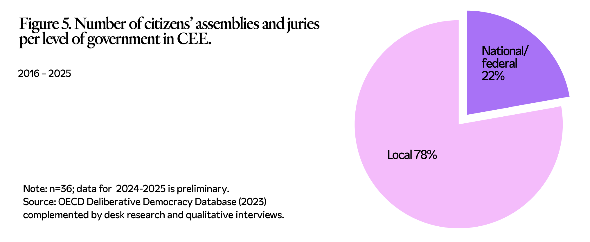 Most of the examples collected have taken place at the local level (78%), whereas 22% took place at the national level. In some contexts, for example in Hungary, local assemblies are the only possibility as municipalities become bastions of democracy when democracies at the national level are eroding. These numbers can also be explained both by the strategic choice of first piloting representative citizen deliberation on lower stakes local level issues that are closer to people’s everyday lives and, simply, more options for initiating assemblies being at the local level given the number of municipalities compared to national level institutions. Local-level processes are usually less resource intensive. For example, Poland, a clear leader in the region, has almost exclusively focused on local assemblies, with efforts towards a national level coming much later.