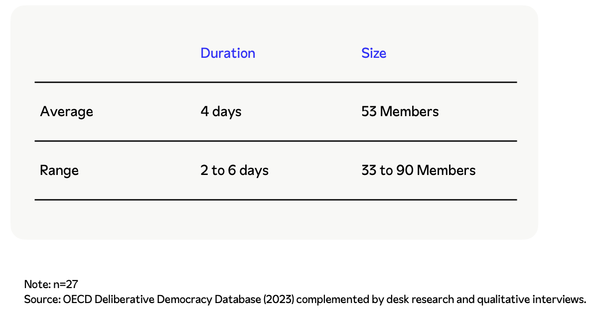 On average, deliberative processes have taken four days (ranging from two to six days) and brought together 53 assembly members (ranging from 33 to 90 members). This demonstrates that, so far, shorter and smaller to mid-size processes have been prioritised, while national level assemblies spanning across multiple months remain to be organised in the future. The choice of shorter, local processes is also tied in with first testing out citizen deliberation on a smaller scale first and with limited resources available.