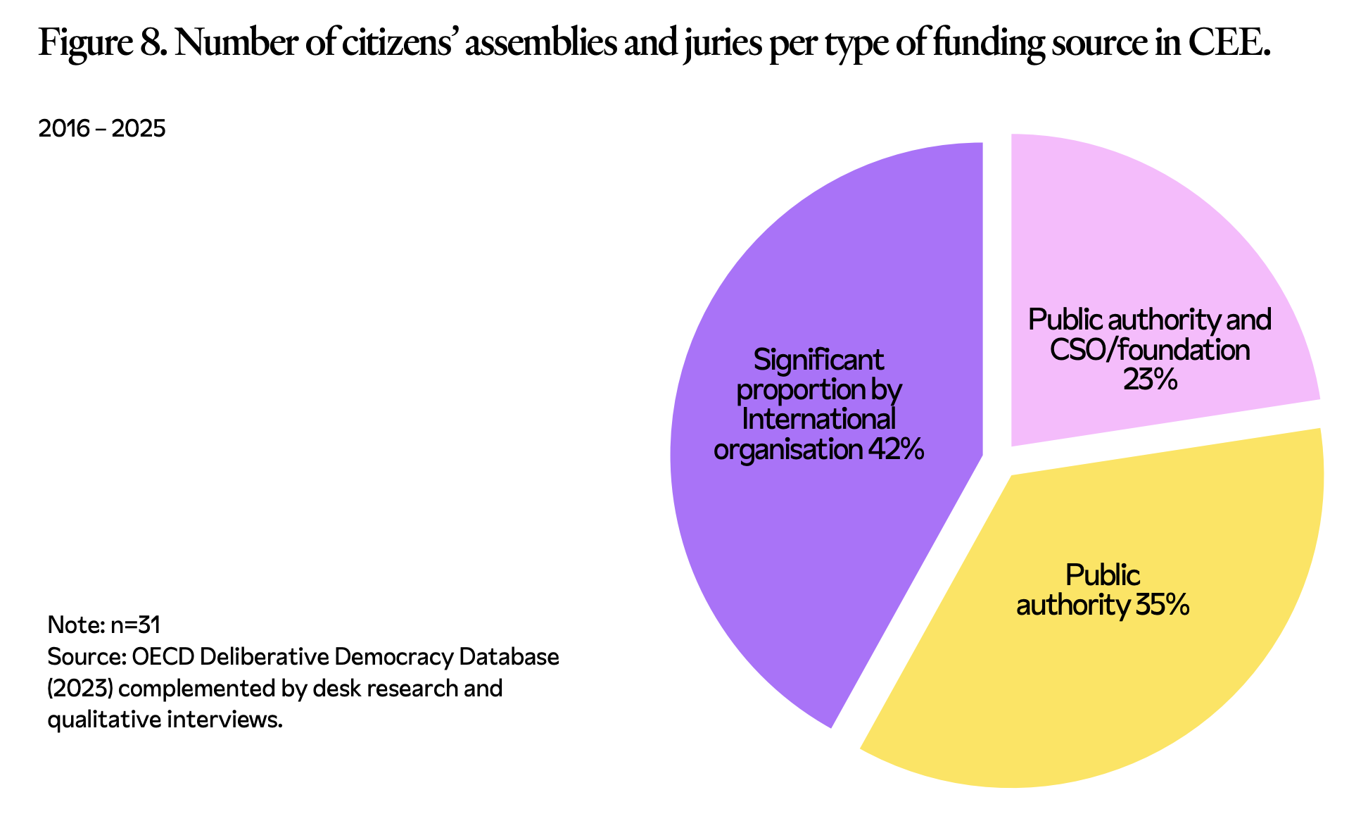 The data also shows a substantial dependency of democratic innovations in the region on international organisations, in particular on European institutions. Funding comes from the programs of European Parliament Democracy Support and Election Coordination Group, the Council of Europe, European Commission DG REGIO, and Horizon Europe.