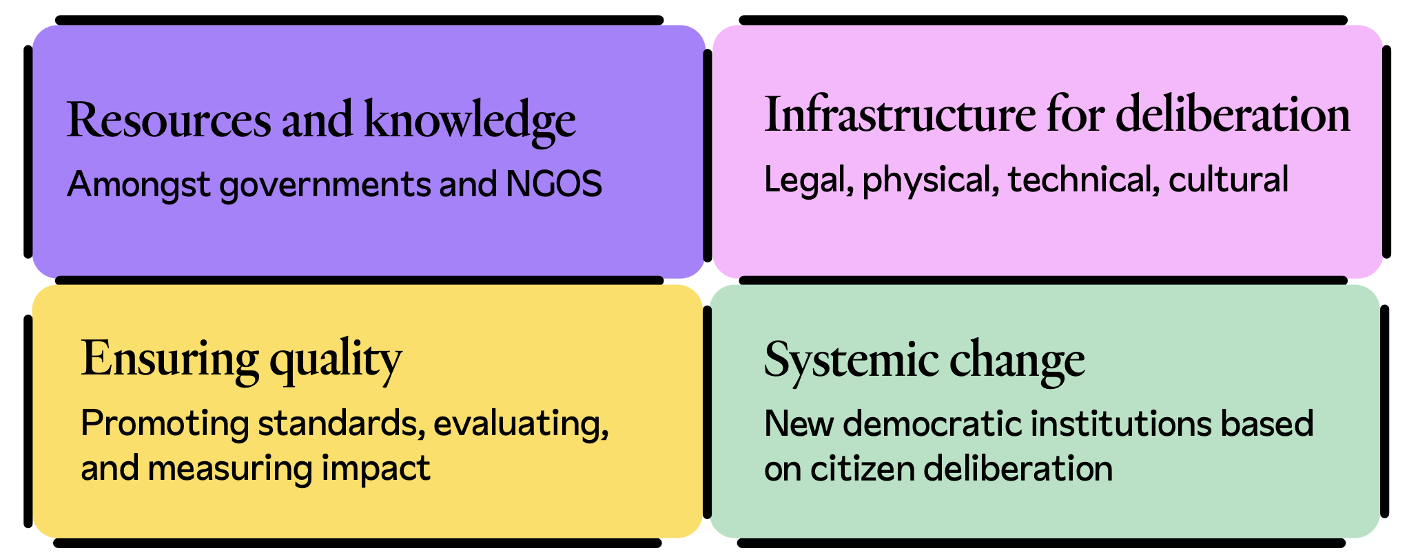 High-quality processes are a prerequisite because there are real risks of undue influence in some of the hybrid regimes and poorlydesigned assemblies and juries can lead to co-option or misuse. Promoting high quality assemblies that meet quality standards helps to ensure their democratic rigour and neutrality.