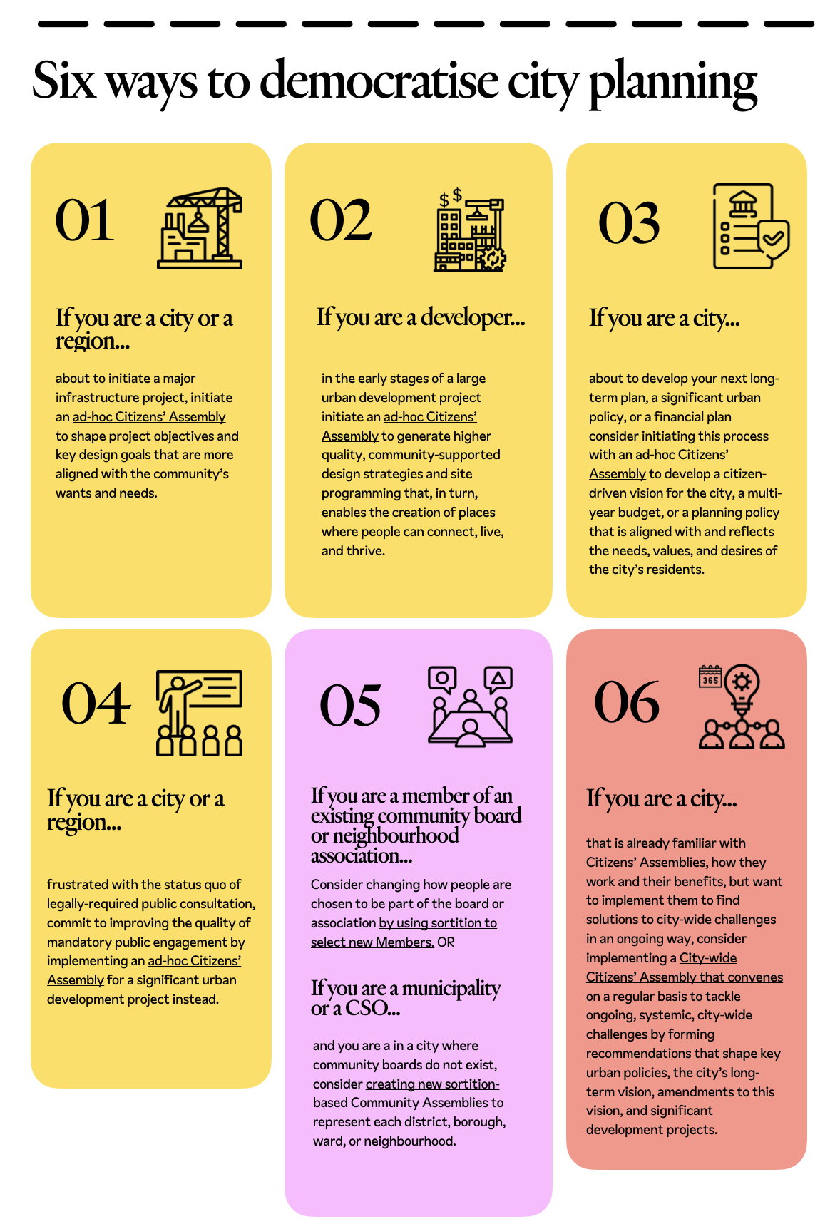 In the table and section below, we have outlined 6 possible scenarios, showing how each Assembly type can be used to address a specific challenge in the urban planning system and we include key considerations for their implementation.