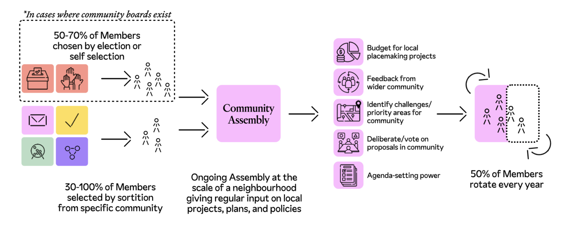 In contexts where these community bodies do not exist, we propose that they could be created, and could be solely formed of Members selected through sortition (see diagram below). They would also be granted the same responsibilities indicated above.