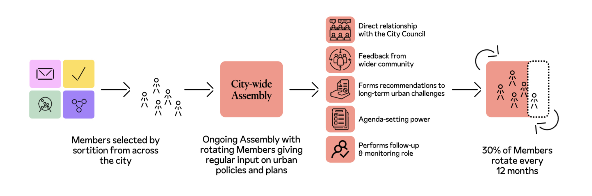 Each part of this proposal is understood as one element in a wider ecosystem of actors, wider engagement processes, and key moments of decision-making - all of which come together to form an ecosystem. We see the different Assemblies connecting to each other, to the existing infrastructure of a city, and key people and organisations as fundamental to the cultivation of a more democratic, citizen-empowered culture of deliberation.
