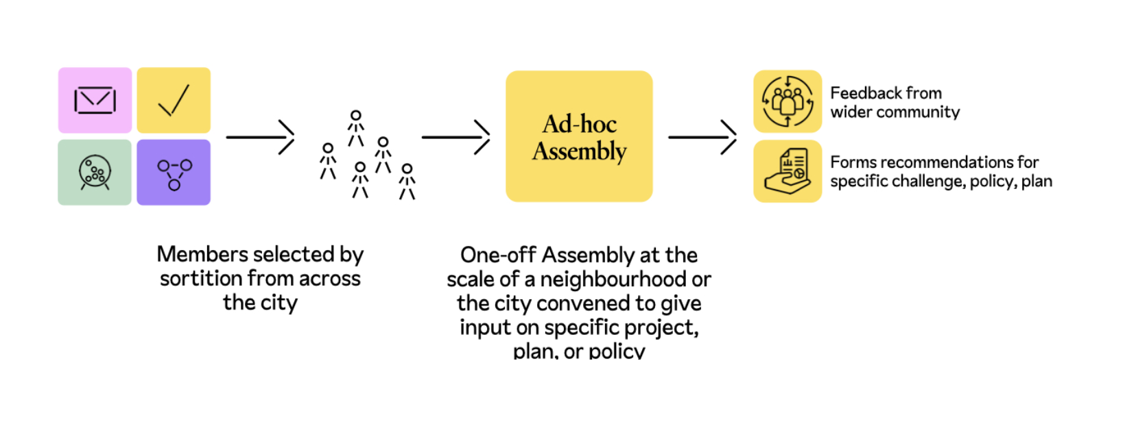 It is also important to consider how each Assembly type could plug into the specific timelines of the many city projects, plans, and policies happening at any given time. For example, at a national or regional scale, an Ad-hoc Assembly could be implemented to produce recommendations for new policies, or during a period when amendments to a particular piece of planning legislation, or a building code are being made.
