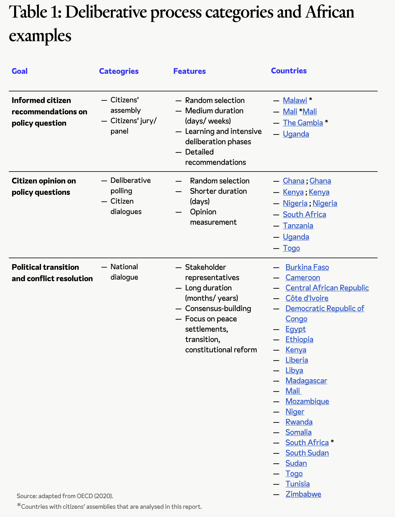 The case studies also include a mix of examples at varying stages in the deliberative lifecycle – from fully completed events (Mali, Malawi) to the early stages of the impact phase (The Gambia). This temporal diversity requires us to be flexible in how we apply the analysis framework. Some cases illuminate design integrity and preparatory processes, while others provide insights into deliberative quality, recommendation development, or longer-term democratic impacts.