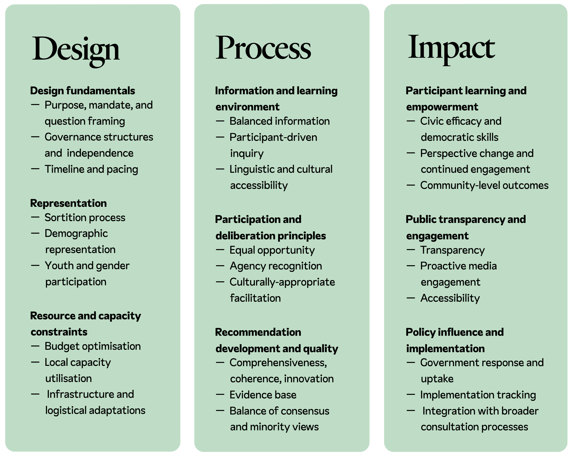 In the process phase, we shift our focus to how assemblies actually function during implementation and the quality of their primary outputs. We assess information provision, deliberative quality, participation dynamics, and the development of high-quality recommendations that emerge from the deliberation process.