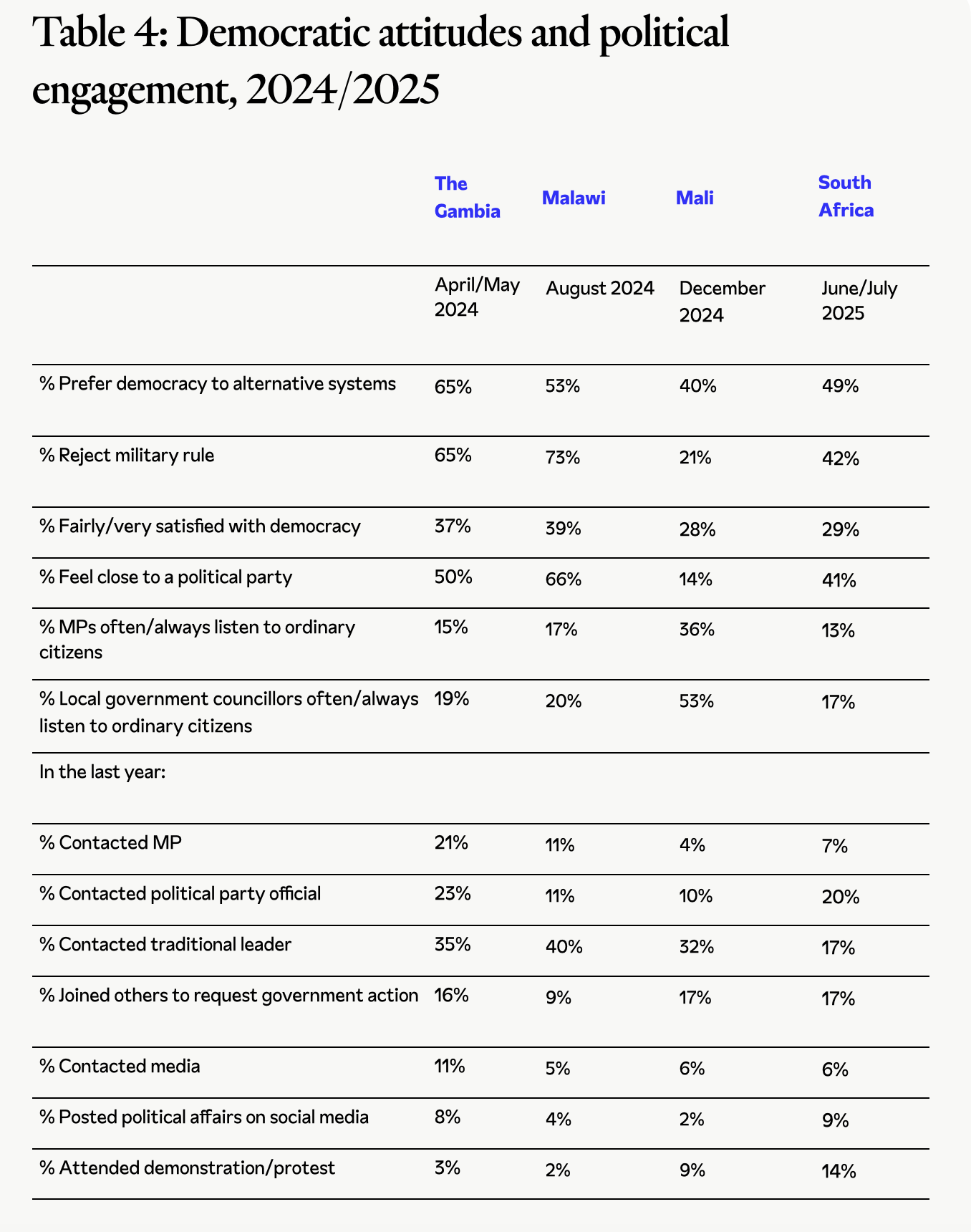 Public opinion data from Afrobarometer reveals the wide variety in both democratic attitudes and modes of civic engagement across The Gambia, Malawi, Mali, and South Africa (Table 4, on the next page). Support for democracy is highest in The Gambia (65%) and lowest in Mali (40%), while rejection of military rule is particularly strong in Malawi (73%) but strikingly weak in Mali (21%). As in much of the continent, satisfaction with democracy is low across all four countries, ranging from 28% in Mali to 39% in Malawi. This indicates widespread frustration with democratic performance.