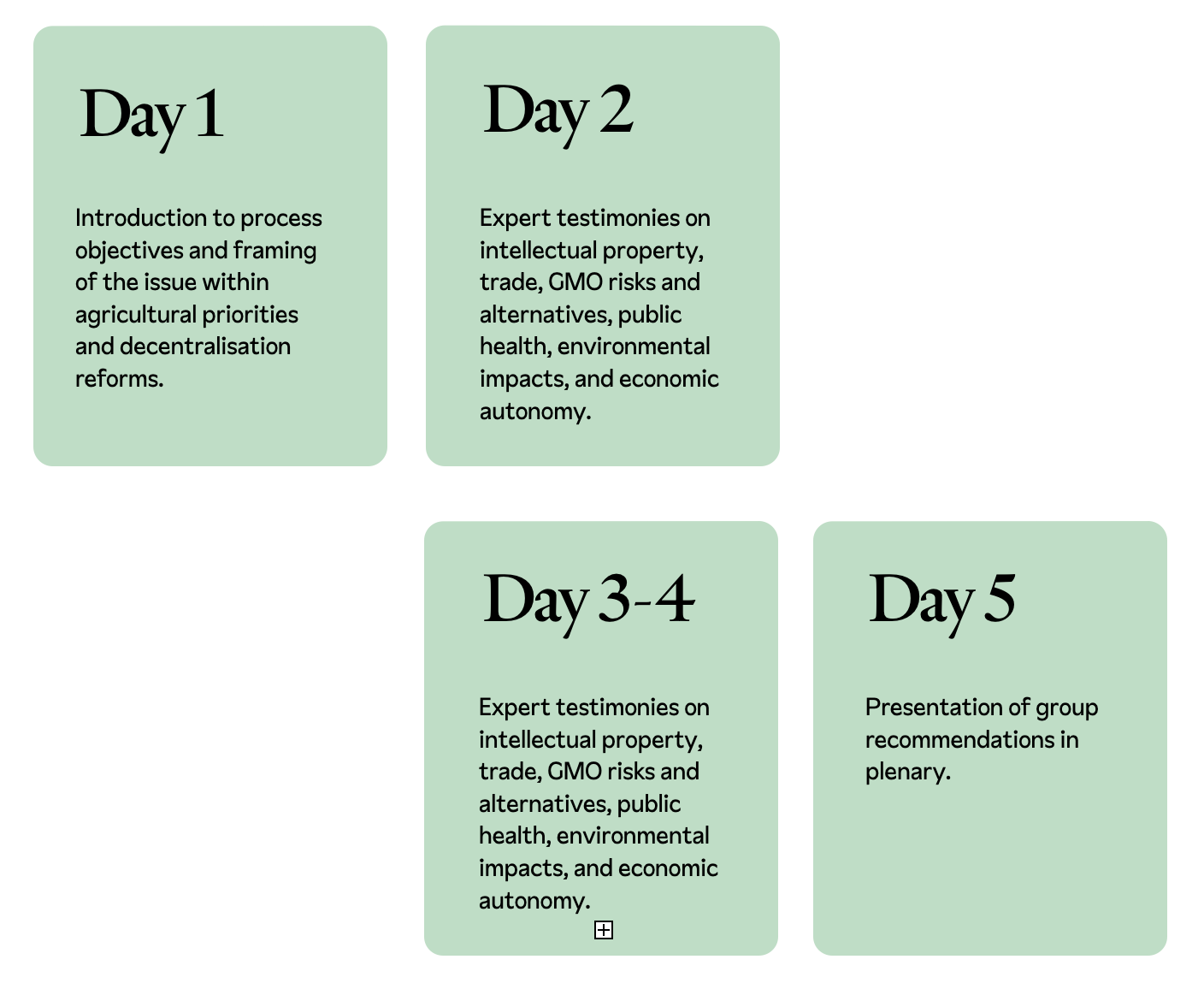 Jurors heard testimonies from 15 international specialist witnesses (agricultural scientists, development economists, farmer organisations, and civil society representatives) before engaging in extended deliberations in four separate “commissions” representing different producer groups: (1) farmers and forest users; (2) women; (3) herders and fishermen; and (4) food processors.