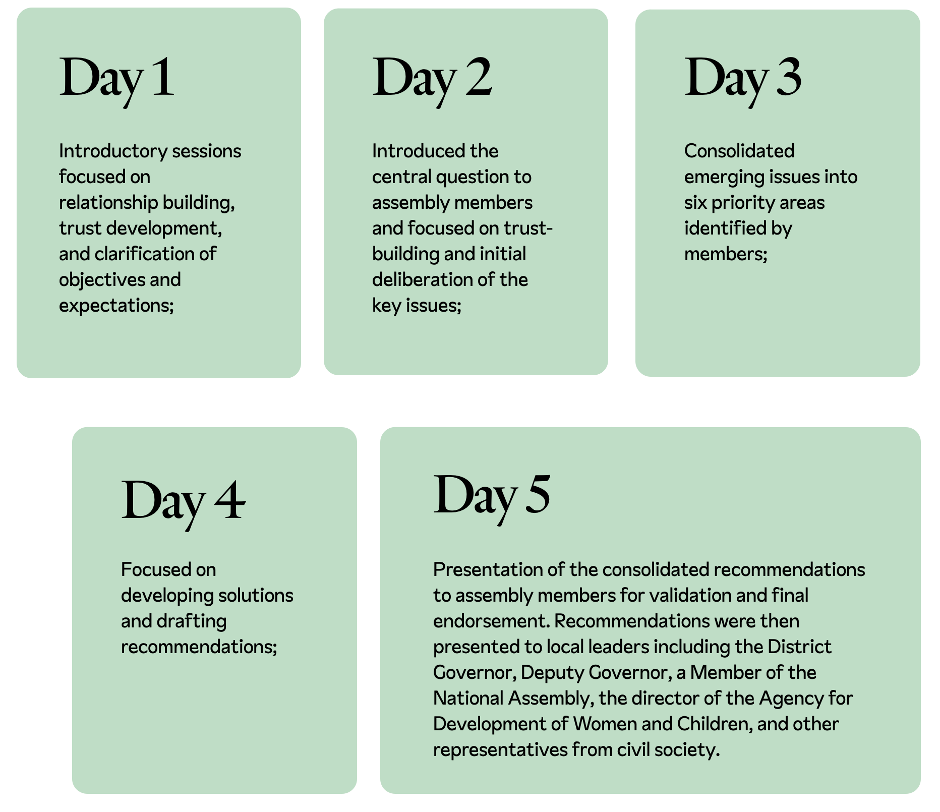 The deliberation process emphasised participant-driven inquiry by inviting assembly members to scrutinise and refine the central question during deliberations. Facilitators also stressed that trust‑building on the first day was critical for enabling meaningful deliberation, particularly given that many assembly members had never engaged in structured political discussion (Gaye, C., personal communication, 2025b). This approach strengthened participant agency in shaping the agenda. Members felt sufficiently comfortable to express concerns that the assembly question was too broad and, through collective discussion and multiple rounds of voting, identified and ranked six priority areas. This allowed the deliberation to focus on more concrete themes.