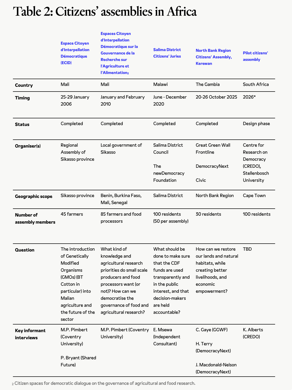 We apply our analytical framework to three case studies that span different African contexts and deliberative approaches (Table 3, on the next page). The first, Mali’s Espace Citoyen d'Interpellation Démocratique (Citizen's Space for Democratic Deliberation, or ECID), convened local farmers in 2006 to deliberate on the proposed introduction of genetically modified organisms (GMOs) into Malian agriculture. The second case, the Citizens’ Juries held in Salima District in 2020, addressed citizen preferences on local resource allocation (constituency development funds) in Malawi. Lastly, the 2025 North Bank Region Citizens’ Assembly in Kerewan, The Gambia illustrates the use of community-based deliberation to address sustainable natural resource governance in the face of climate change.