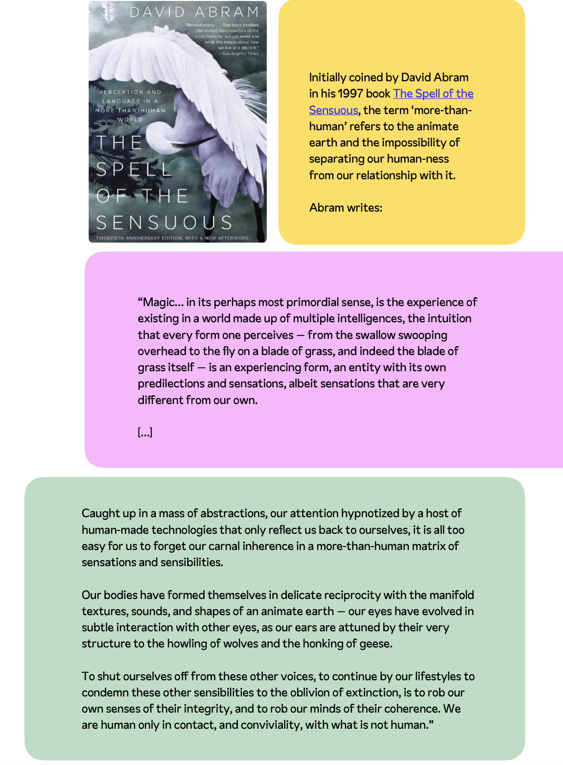 “A genuinely ecological approach does not work to attain a mentally envisioned future, but strives to enter, ever more deeply, into the sensorial present. It strives to become ever more awake to the other lives, the other forms of sentience and sensibility that surround us in the open field of the present moment.”