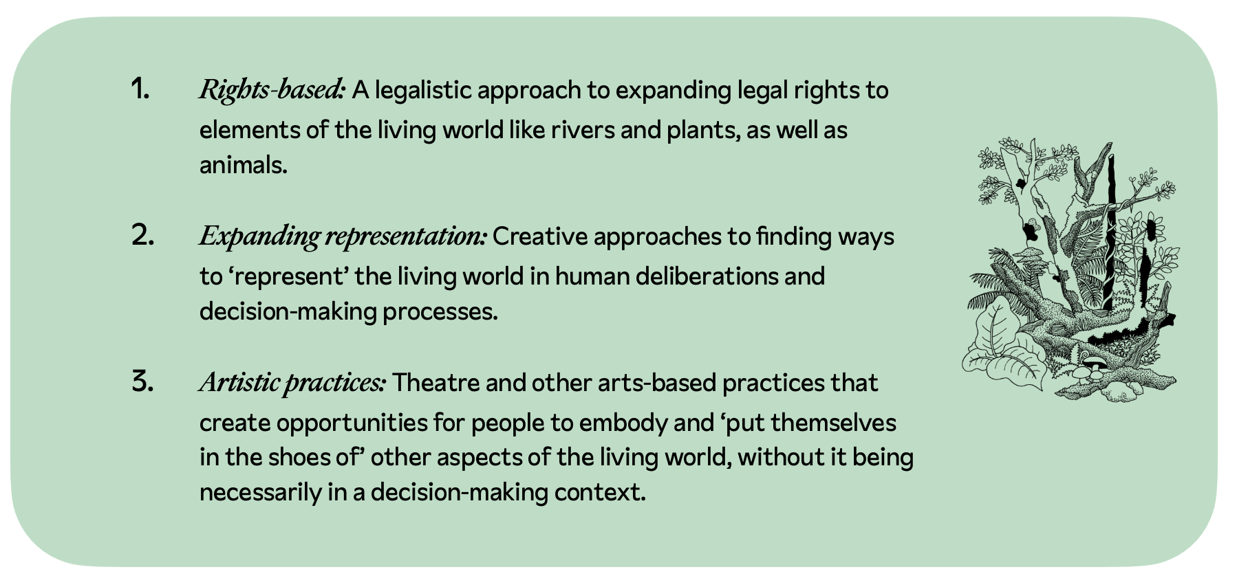How to evolve and innovate such governance systems in a way that brings in more-than-human elements? We have identified a growing number of examples across Europe that are doing so in different ways. The three main approaches as I have come to understand them are:
