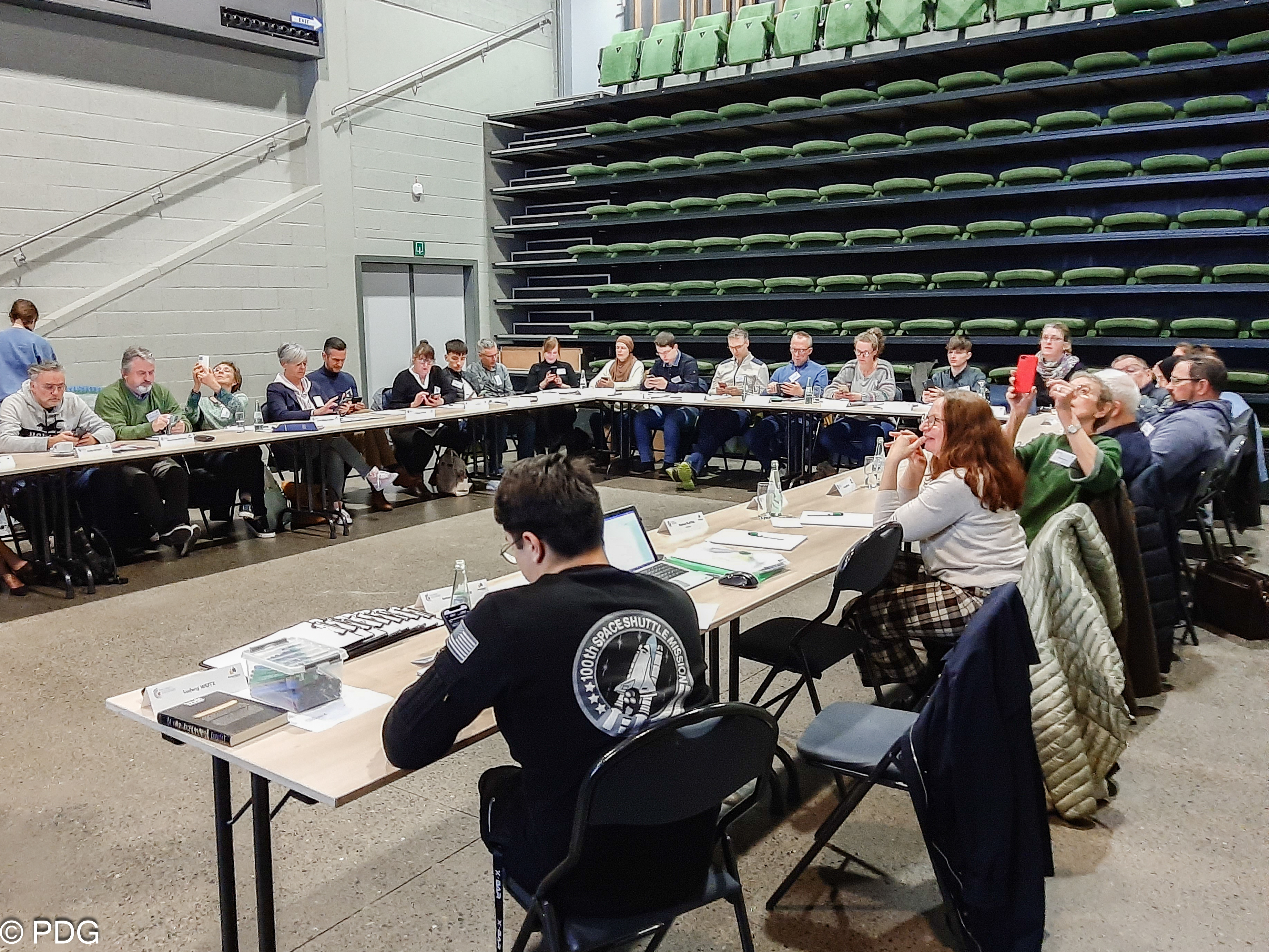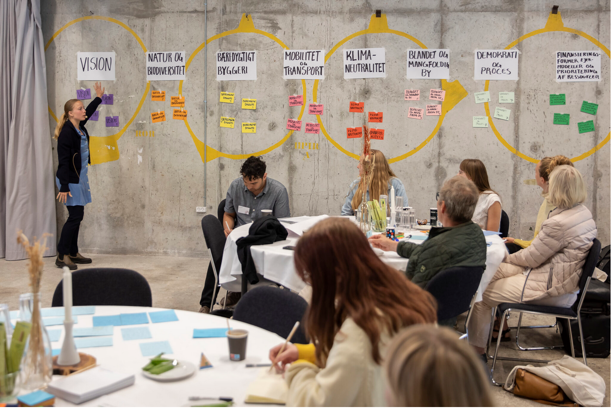 At Demokrati Garage they have succeeded in creating an atmosphere for deliberation and exercising democracy. Central to this is the Folkestuen (the Peoples’ Living Room). This comprises a 160 square metre space transformed from a former mechanics garage, with vaulted ceilings and exposed timber beams, combining the rustic character of a workshop with a homely domestic interior. It has been furnished with a small bar, technical equipment, and moveable furniture, including round tables and chairs. The smell of freshly baked bread seeps into the space from the bakery next door, flowers are on the tables, and large curtains are hung to manage the acoustics and mediate daylight entering from a mix of old and new windows. Johan emphasises that cosiness is just as important as creating a professional atmosphere with a high level of hospitality and careful hosting. The Folkestuen also serves other organisations as it can be rented and is used for all kinds of events throughout the year when not used for assemblies.