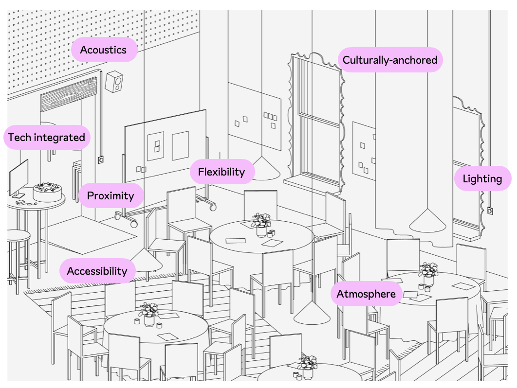 From our conversations, we learned that poor lighting quality and limited options for adjusting light sources are recurring challenges. Practitioners look for venues that offer a mix of lighting scenarios to enable visual accessibility and a comfortable atmosphere – a space which is professional and cosy at once. A lack of sunlight affects visibility and often lowers people’s energy levels, while excessive artificial lighting can feel sterile and cold. Moreover, the ability to adjust light conditions is critical to create a comfortable environment throughout the day and to facilitate digital presentations or other situations where light must be dimmed.