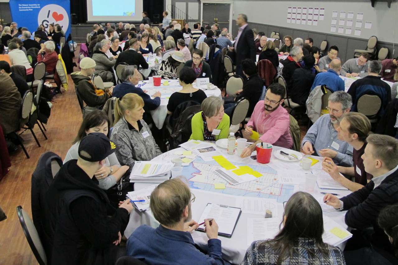 The historic building, on the other hand, was described by the conveners as a more neutral space and conducive for assembly members from very different backgrounds to feel equally welcome and take the process seriously without excessive partisanship. However, lighting conditions were sometimes hard to control, and the acoustic conditions meant that when many people were speaking in small groups, it was difficult to hear the person next to you or the interpreter, in cases where deliberations were multilingual. For this reason, small groups retreated into the hallways and lobby of the building, but were often interrupted by people passing by.