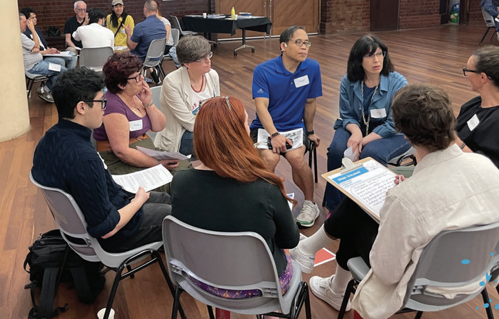 Another important design choice MosaicLab makes is to avoid the use of tables for deliberations amongst assembly members. Tables are sometimes used when absolutely necessary, but otherwise discussions take place as photographed below, in circle formation sitting in chairs.