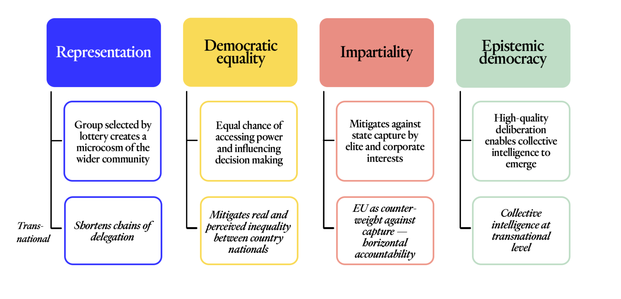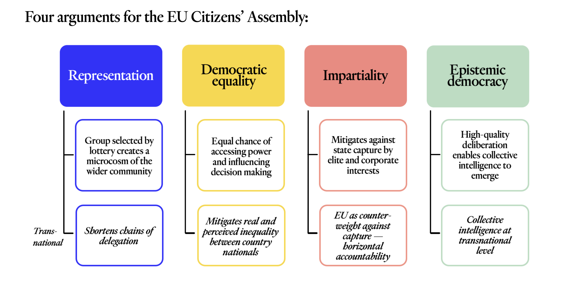 The rationale for re-introducing Assemblies with Members selected by lottery in politics has been demonstrated at length both in theory and practice. Four arguments are commonly put forward for sortition. We consider how they scale up to the EU level, as there are, in fact, good reasons to think that these arguments are as relevant in the EU as elsewhere, perhaps even more so given its transnational character as a ‘demoicracy’, meaning a union of peoples who govern together but not as one.