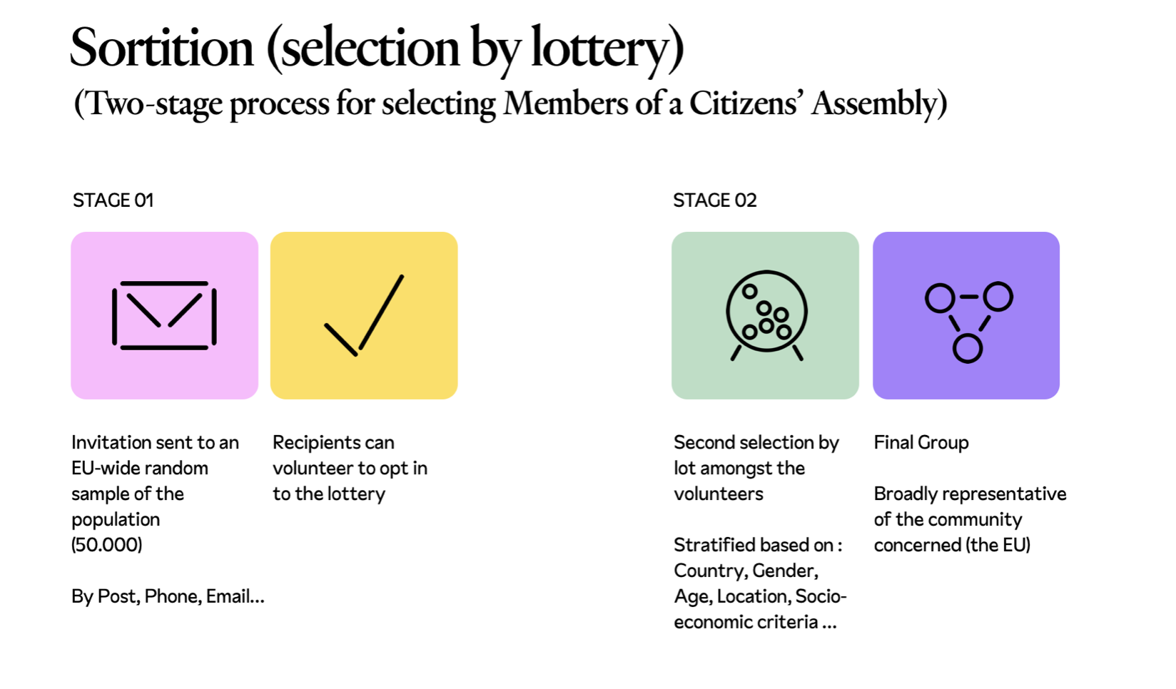 Such as it is practised today, sortition usually involves two stages. In a first stage, a lottery takes place to invite people to be Assembly Members from a pool of randomly drawn citizens. In a second stage, amongst everybody who responds positively to this first invitation, there is a process of “stratification” to ensure broad representativeness of the community, following the techniques developed for opinion polls: the organisers first define quotas by gender, age, regions, education, income, race, sometimes behavioural attitudes, to which other criteria can be added. The final group making up a Citizens’ Assembly are therefore selected by lottery amongst everybody who responded positively to the initial invitation, ensuring broad representativeness along the criteria identified.